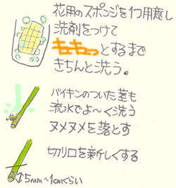 『きれいな水』 を保つために、 時々、花器(または食器など)の水を交換します。 これを 『水換え』 といいます。