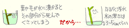 水は、基本的に浅水(5cm程度)。 水に漬かる部分の葉をすべて取ります。