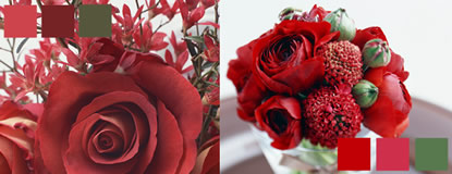 たとえば、赤系統で彩度が高く、 暗いトーンと、明るいトーン。