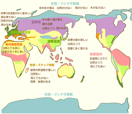 地球は、場所によって、気温・日照の量・雨の量 が違います。