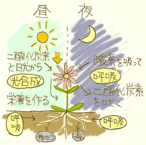 お花も、生きていますから、あなたと同じように 呼吸 をしています。 酸素を吸って、二酸化炭素を吐き出しています。