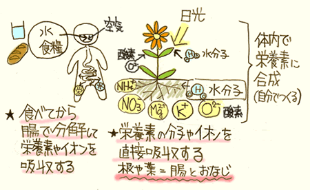 植物は、はじめから無機物(イオン・成分)を直接吸収します。