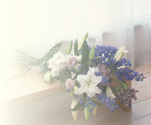 ご本堂用のお花や、お供え用のお遣い物の花と同じスタイル (洋花中心で淡い色・マムは入っても綺麗です)にすると良いでしょう。